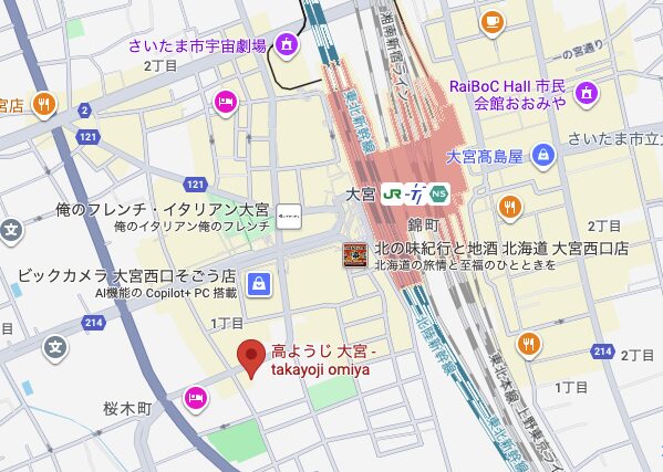 場所:高ようじ https://takayoji-omiya.jp/omiya/ 大宮駅西口駅歩いて3分 (下記地図ご参照ください)